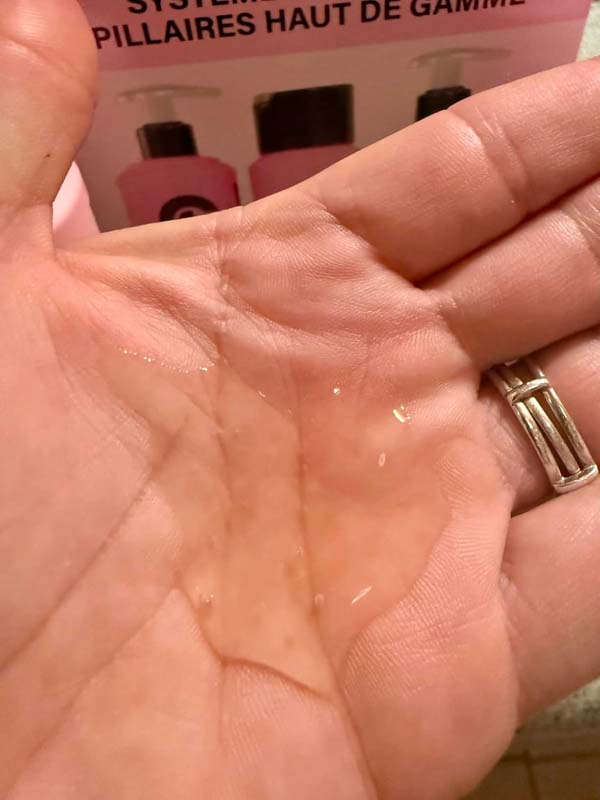 I really wanted to like this. Sulfate free, silicone free, plus a leave-in? This is all the stuff I want in a hair care line! The product comes in a really nice pack, well wrapped, no leakage here. The bottles are all pretty big and look like you’ll get plenty of use. They’re all cute, pink, matching. They look cute lined up in my shower.