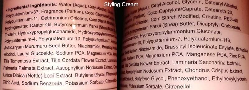 Styling Cream: Water (Aqua), Cetyl Alcohol, Glycerin, Cetearyl Alcohol, Polyquaternium-37, Fragrance (Parfum), Coco-Caprylate/Caprate, Ceteareth-20, Polyquaternium-11, Cetrimonium Chloride, Corn Starch Modified, Creatine, PEG-40 Hydrogenated Castor Oil, Butyrospermum Parkii (Shea) Butter, Dicaprylyl Carbonate, Triolein, Hydroxypropylgluconamide, Hydroxypropylammonium Gluconate, Polyquaternium-4, Polyquaternium-10, Polyquaternium-7, Polyquaternium-116, Astocaryum Murumuru Seed Butter, Niacinamide, Brassicyl Isoleucinate Esylate, Brassica Alcohol, Lauryl Glucoside, Sodium PCA, Magnesium PCA, Manganese PCA, Zinc PCA, Tilia Tomentosa Extract, Tilia Cordata Flower Extract, Laminaria Saccharina Extract, Palmaria Palmata Extract, Ascophyllum Nodosum Extract, Chondrus Crispus Extract, Urtica Dioica (Nettle) Leaf Extract, Butylene Glycol, Phenoxyethanol, Ethylhexylglycerin, Citric Acid, Sodium Benzoate, Potassium Sorbate, Citronellol