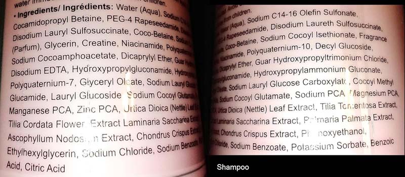 Shampoo: Water (Aqua), Sodium C14-16 Olefin Sulfonate, Cocamidopropyl Betaine, PEG-4 Rapeseedamide, Disodium Laureth Sulfosuccinate,