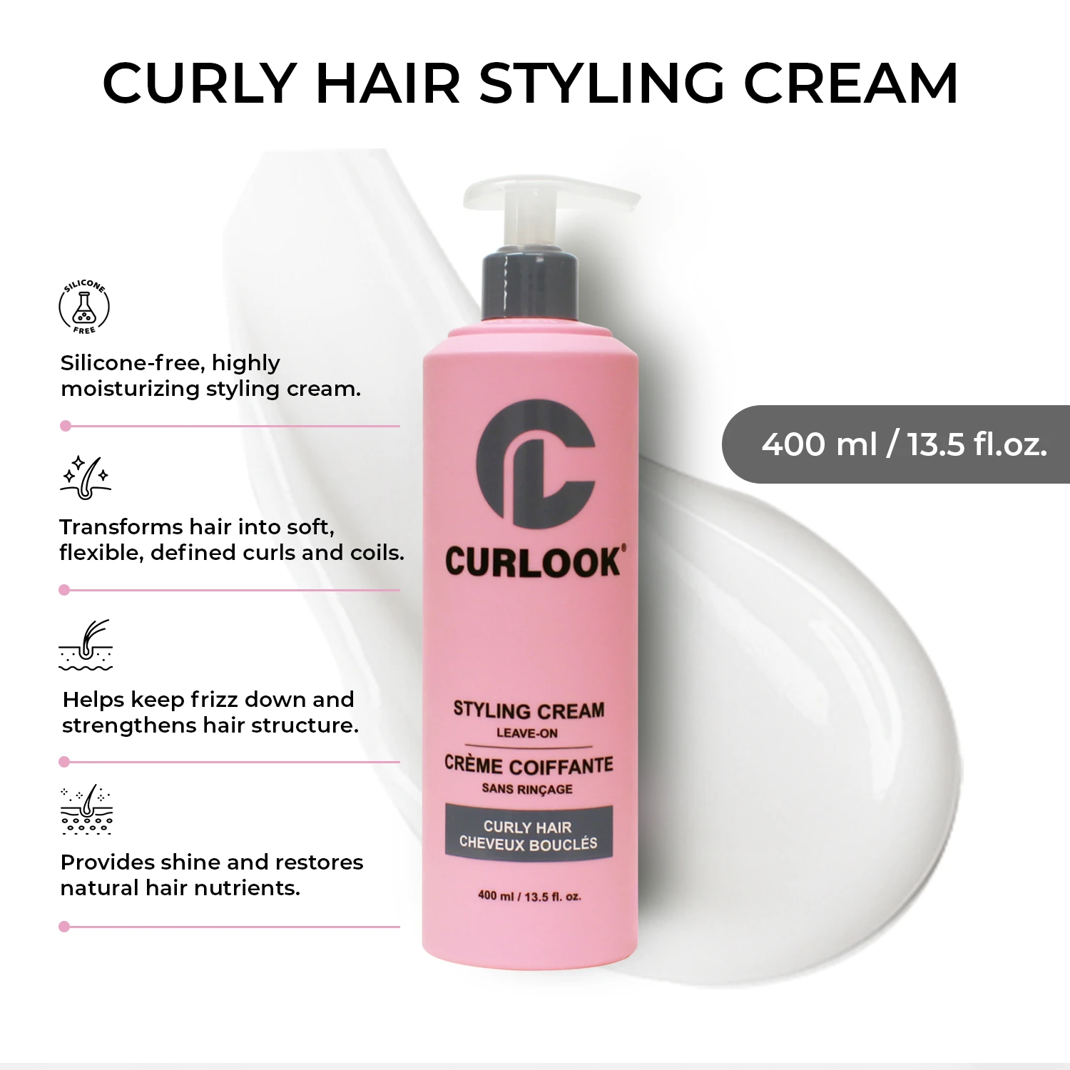 Curlook silicone-free highly moisturizing Hair Styling Cream that transforms and revives hair into soft, flexible, defined curls and coils. It helps keep the frizz down, rebuilds and strengthens hair structure from within. Provides shine, smooth hair and restore natural hair nutrients for bouncy and healthy-looking curls.