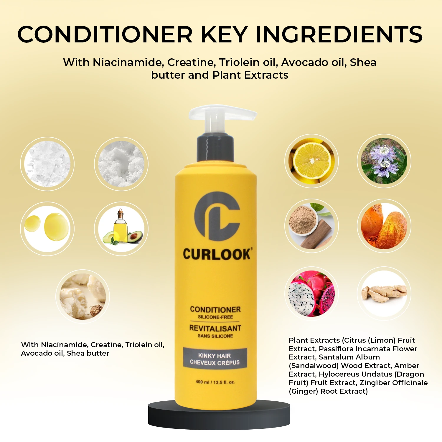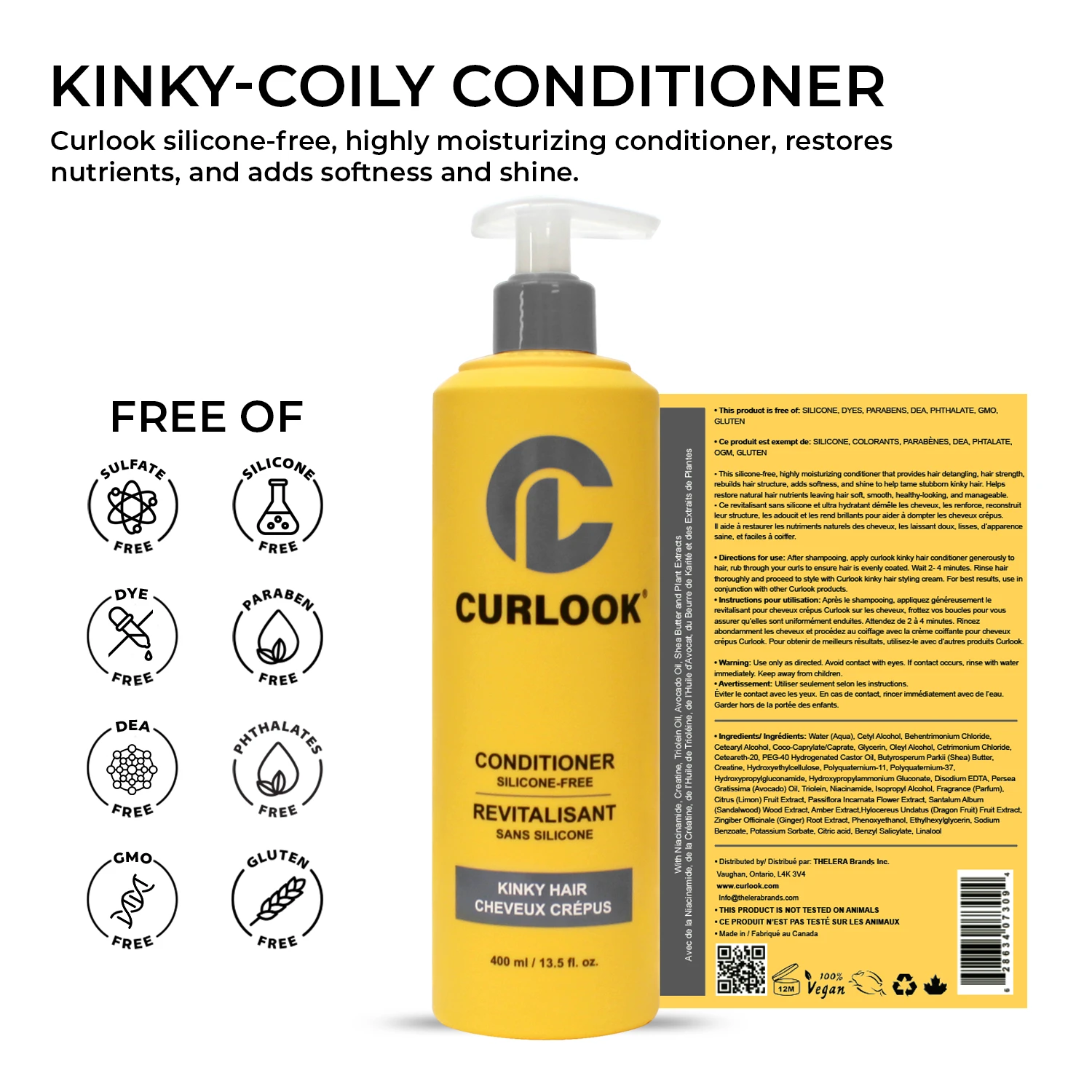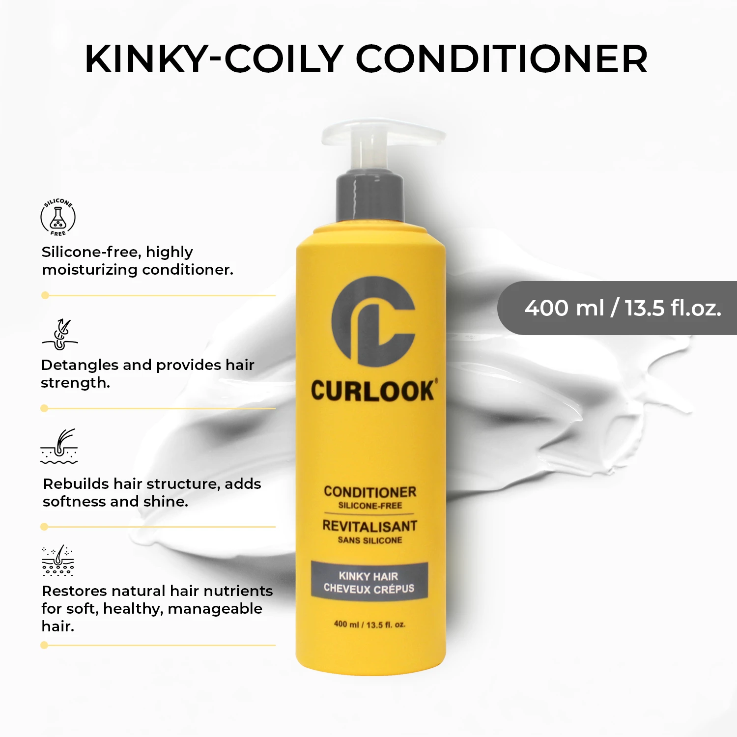 Curlook silicone-free highly moisturizing conditioner that provides hair detangling, hair strength, rebuilds hair structure, adds softness, and shine to help tame stubborn kinky hair. Helps restore natural hair nutrients leaving hair soft, smooth, healthy-looking, and manageable.