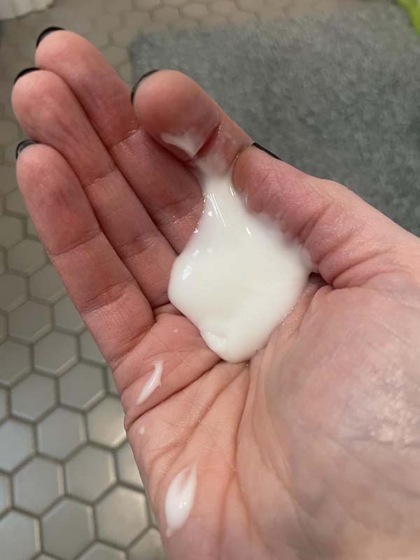 It smells very nice. Not too strong, but still leaves my hair feeling fresh. Nice and thick, as you can see in the picture, so it works in well. I like the pump also, which makes dispensing it easy. The bottles are thick too so they won’t suck in/cave in like a lot of cheaper bottles.
