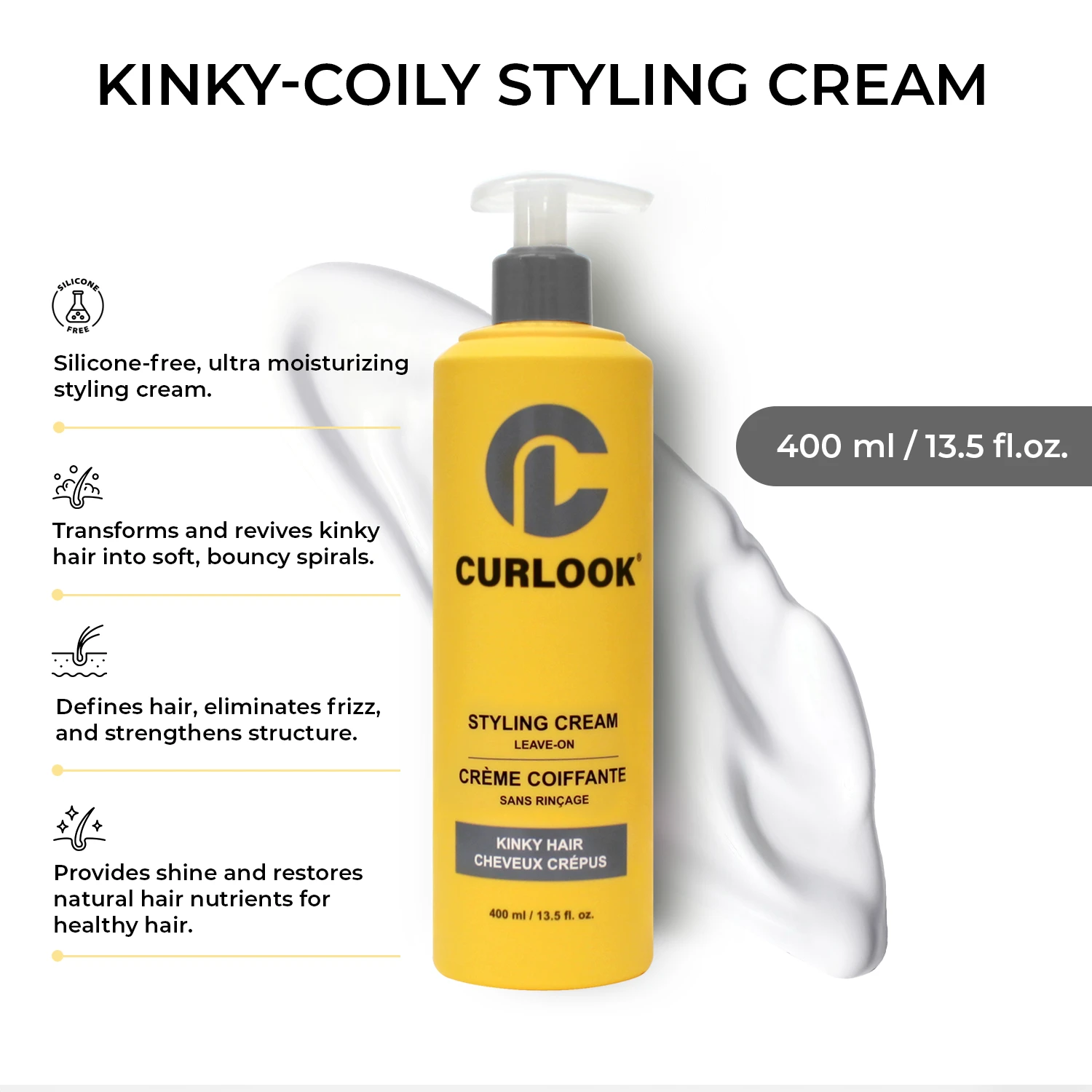 Curlook silicone-free ultra moisturizing Hair Styling Cream that effortlessly transforms and revives Kinky hair into soft, luscious, bouncy spirals. It stretches, relaxes, and defines tightly wound tresses while eliminating frizz and need for chemicals or thermal application. Rebuilds and strengthens hair structure from within. Provides shiny and smooth hair and restores natural hair nutrients for tamed and healthy-looking kinky hair.