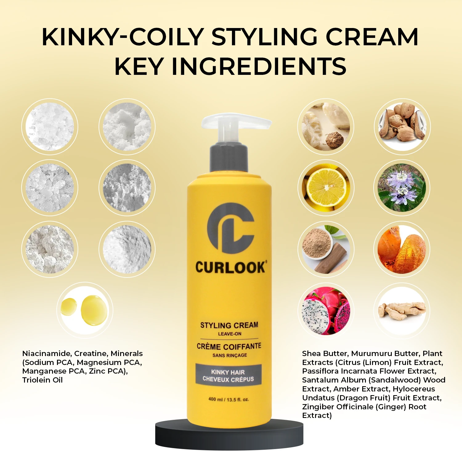 The CURLOOK Kinky-Coily Hair Leave-In Styling Cream is a silicone-free, deeply hydrating product designed to define and maintain natural curl patterns without weighing hair down. Infused with niacinamide, creatine, minerals, triolein oil, shea butter, murumuru butter, and plant extracts, it nourishes strands from root to tip, promoting softness, manageability, and healthy-looking hair.